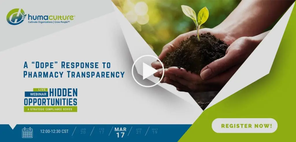 Join us on Thursday, March 17 from 12:00 to 12:30 CST for the third webinar in Humaculture, Inc.’s Hidden Opportunities, Strategic Compliance Series, to learn why the new pharmacy transparency law will not increase transparency; will increase costs, administration, and litigation risk; and how to effectively respond.