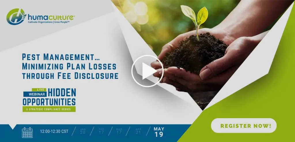 Join us on Thursday, May 19 from 12:00 to 12:30 CST for the fifth webinar in Humaculture, Inc.’s Hidden Opportunities, Strategic Compliance Series, to learn how to use fee disclosure to leverage behavioral design, seek strategic advisors, and optimize plan efficiency.