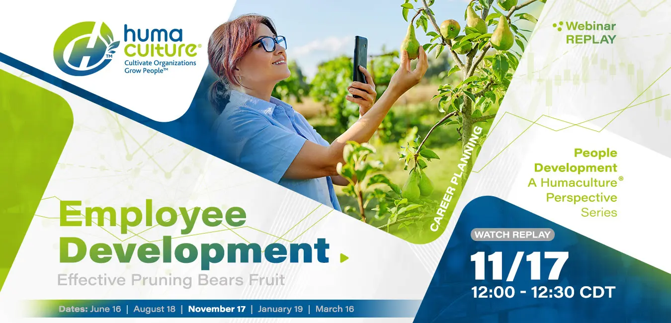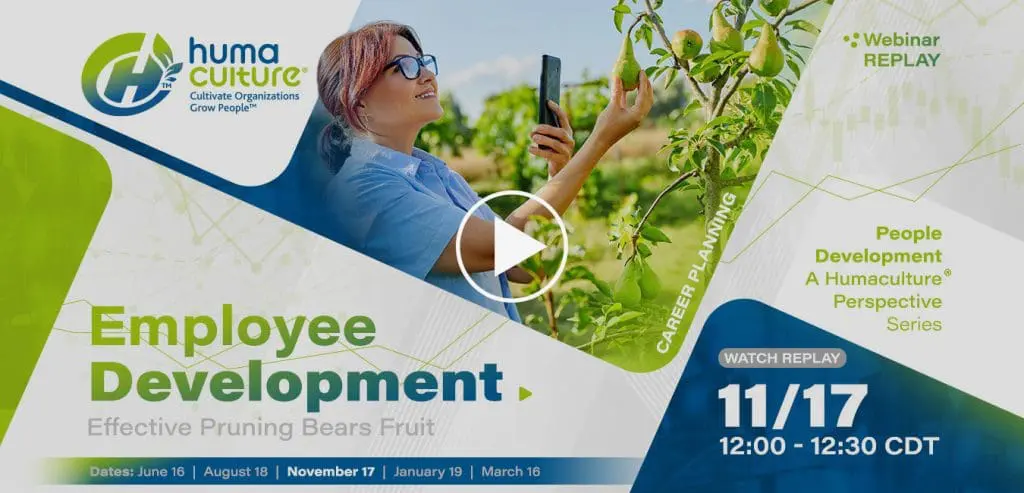 Watch a replay of the third webinar in Humaculture, Inc.’s “People Development: A Humaculture® Perspective Series” to learn how to conduct Career Planning to support employee development, and why “Effective Pruning Bears Fruit” by building employee capabilities.