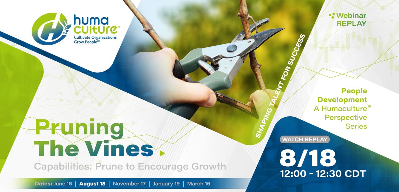 Watch a replay of the second webinar in Humaculture, Inc.’s “People Development: A Humaculture® Perspective Series”, to learn how to shape talent for success by “Pruning the Vines,” using capabilities to prune to encourage growth so employees to fulfill their potential and maximize alignment and productivity.