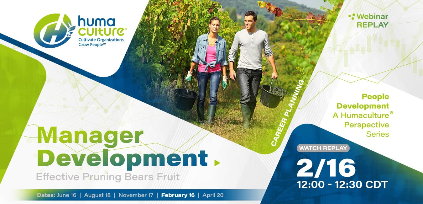 Watch a replay of the fourth webinar in Humaculture, Inc.’s “People Development: A Humaculture® Perspective Series” to learn how to conduct Career Planning to support manager development, and why “Effective Pruning Bears Fruit” by building manager capabilities.